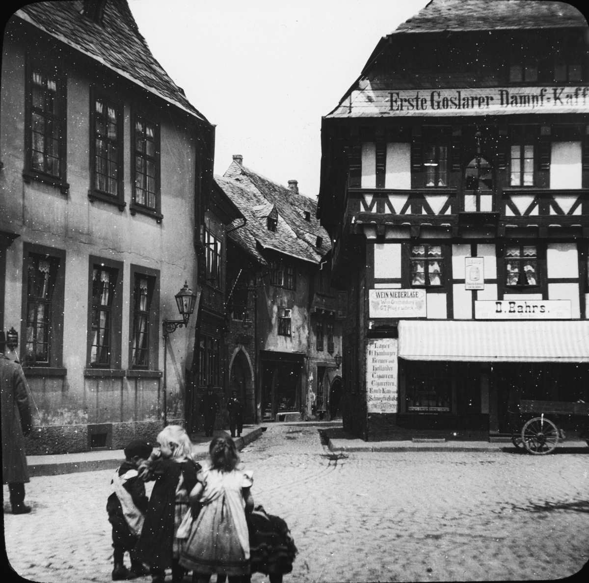 Skioptikonbild med motiv av lekande barn på torg vid Bergstrasse 60 i Goslar. Vid Bahrs Kaffee (kafferosteri).