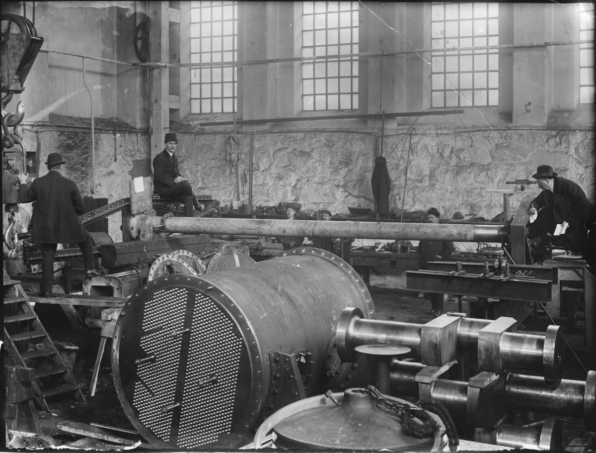 Bergsunds Mekaniska verkstad i Stockholm. Kalibrering av axel, Vid kikaren Albert Isakson, vid protokollet Gustav Dahlby och vid vågen W-Olle.