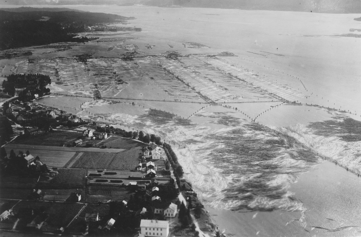 Kramfors aktiebolag. Flygfotografi över timmersorteringsverket vid Sandslån.