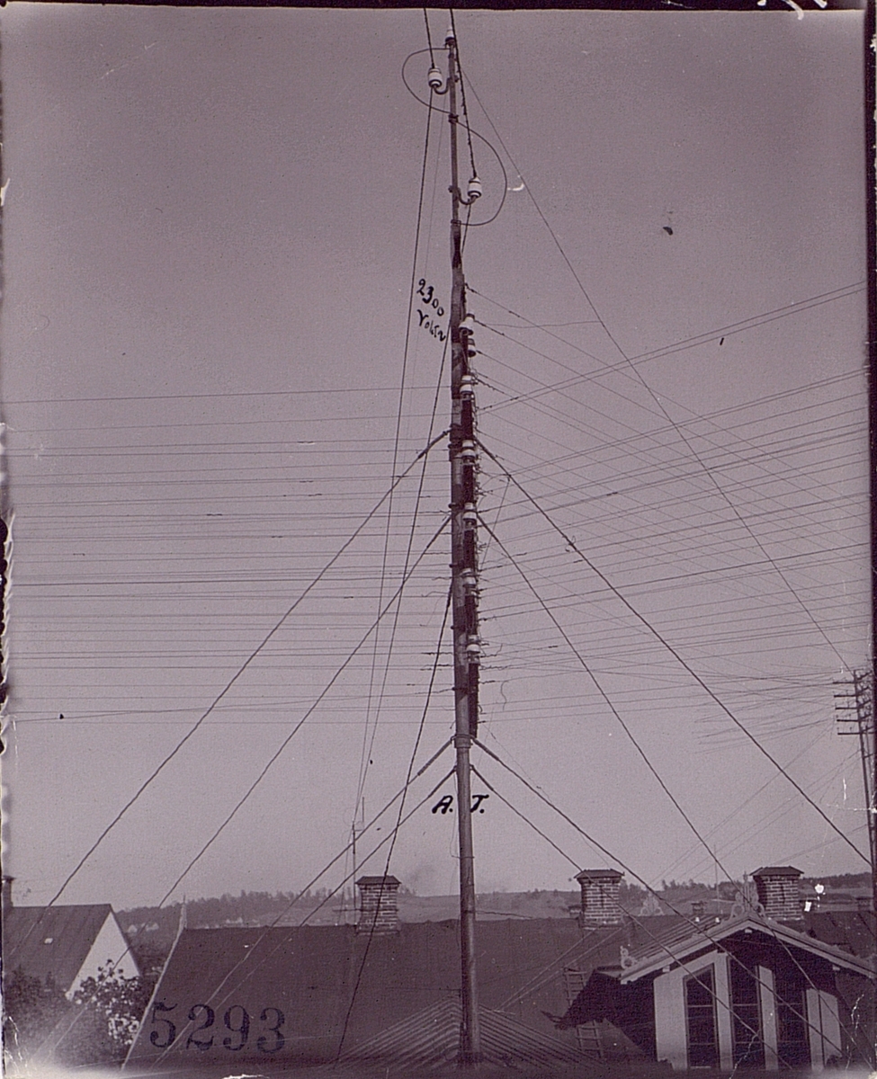 Telefongalge med telefon och högspänningsledningar i Motala 1901-1902. Hotel Nilsons gård, kv.18, tomt 1 i Motala.