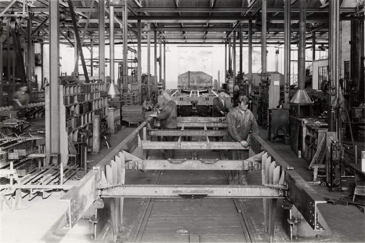 Ihopsättning av underrede på monteringsbockar på AB Gävle Vagnverkstad.