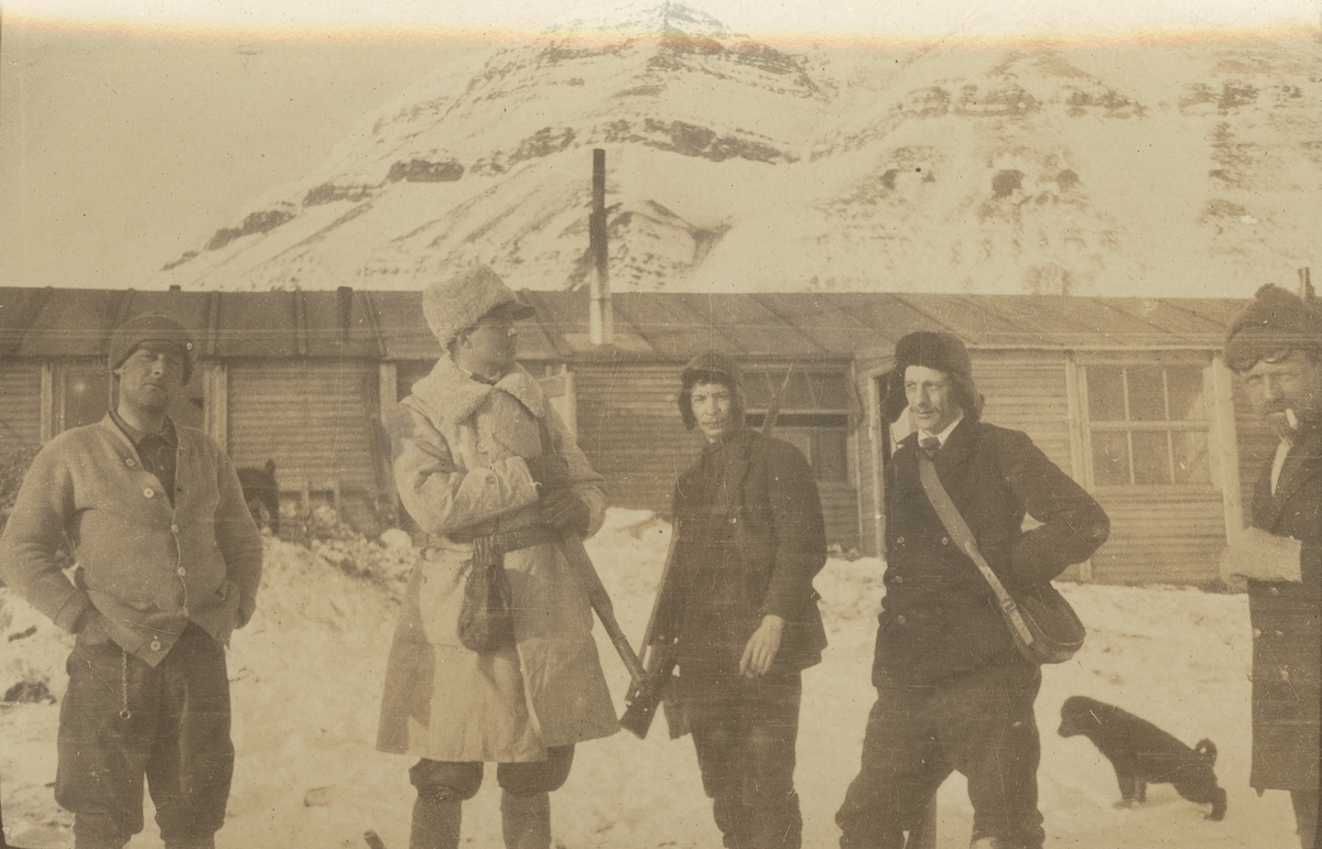Fotografi från expedition till Spetsbergen. Motiv av fyra män som poserar framför ett trähus och snötäckt berg. Två av dem har gevär. I bakgrunden sitter en hund.
