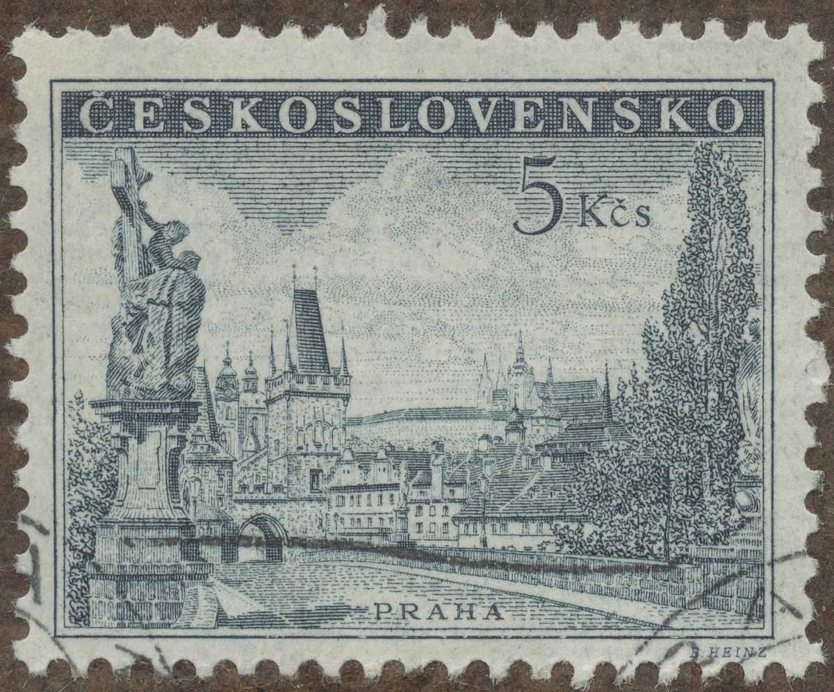 Frimärke från Tscheckoslovakien, 1953. Motiv av Karls Bron och slottet i Prag