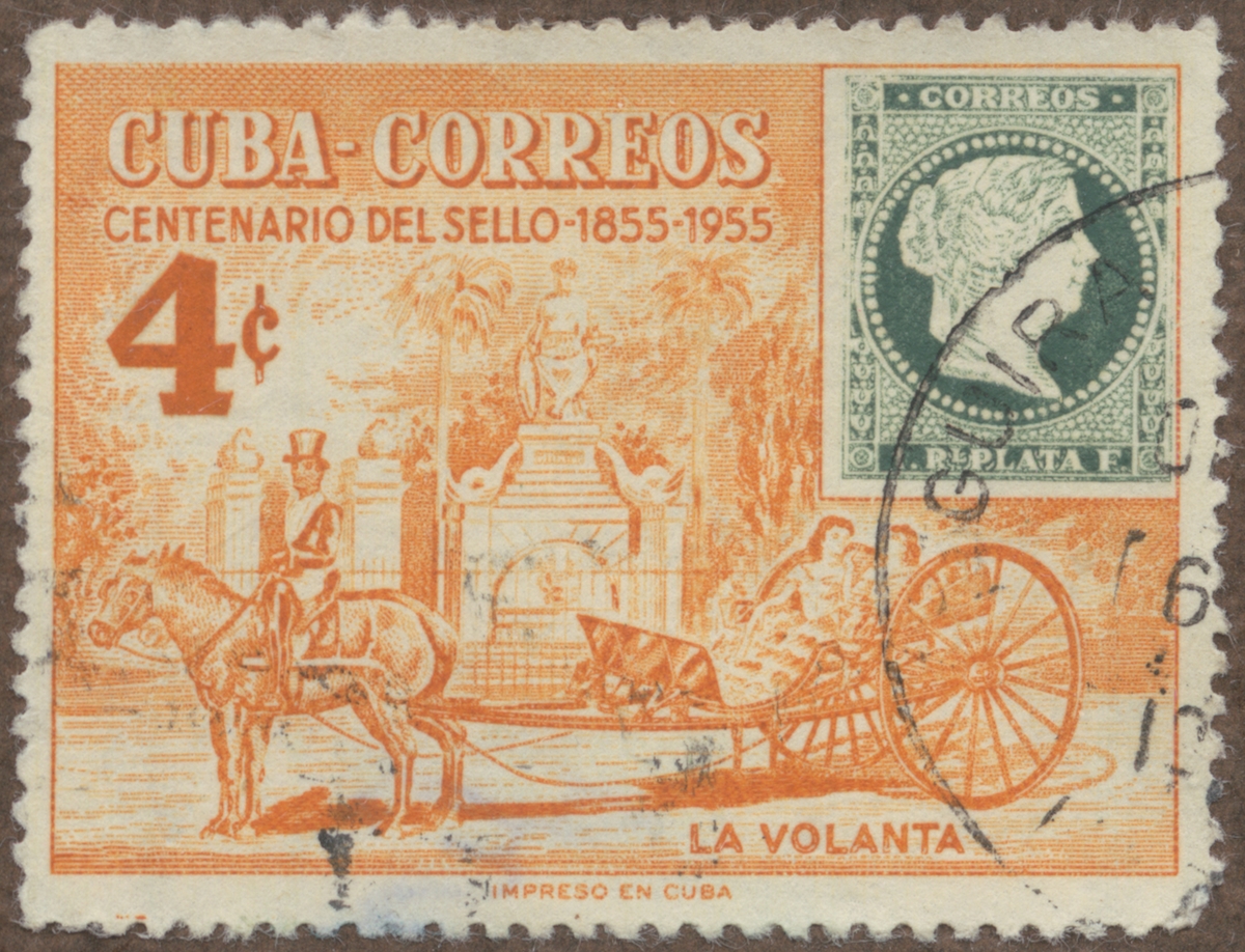 Frimärke från Cuba, 1955. Motiv av Vagn, "Viktoria" med kusk på hästen Cubas frimärken 100 år 1855-1955.
