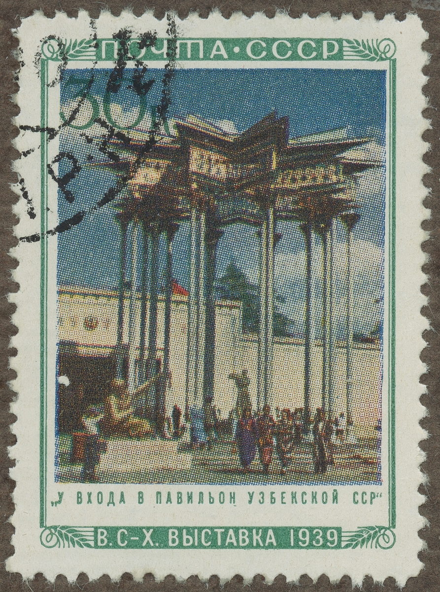 Frimärke från Ryssland, 1940. Motiv av Agrikulturutställning i Ryssland 1940 Paviljongen: Usbecks-Republiken