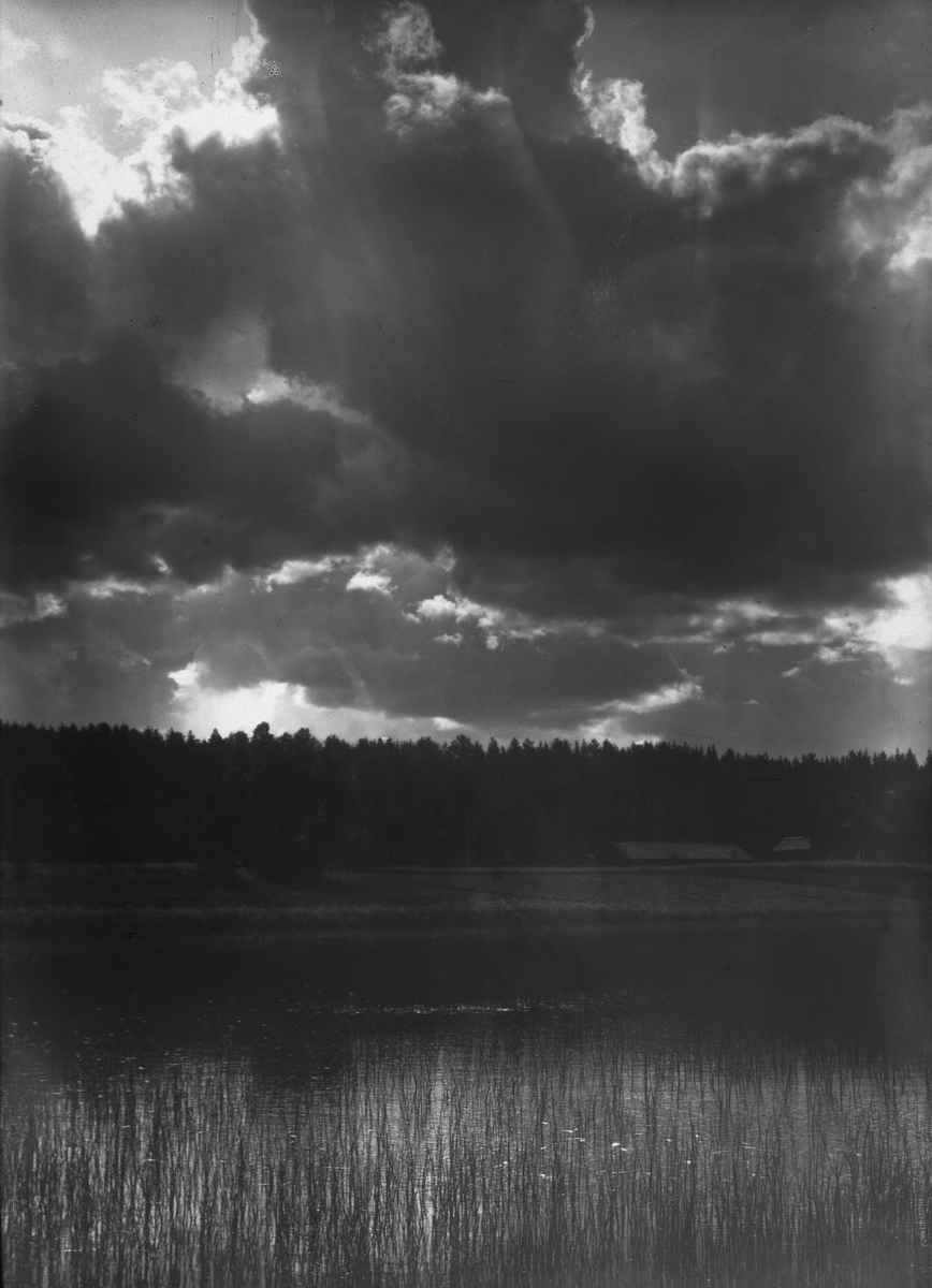 Titel: Fönsterbild med motiv av landskap. Troligen i Hedemoratrakten.