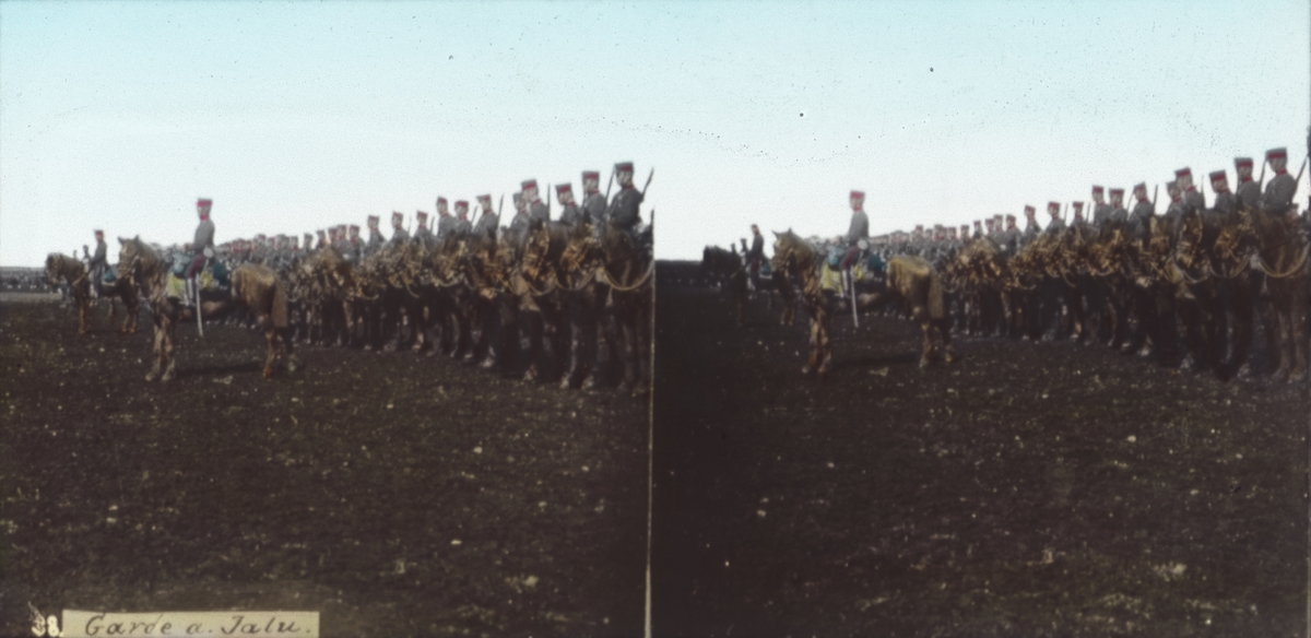 Kollorerad stereoskioptikon med militärhistoriskt motiv."Garde a Jalu". Sodater uppställda vid Jalu i nordöstra Libyen.