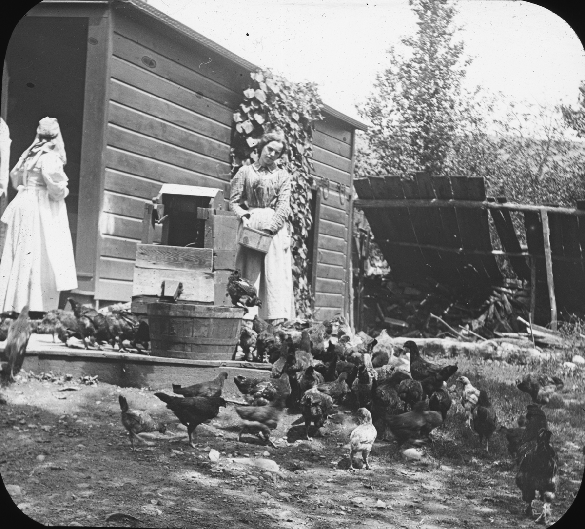 Skioptikonbild. Okänd kvinna matar höns.
