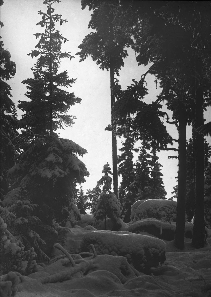 Fönsterbild med motiv av vinterlandskap. Troligen i Hedemoratrakten.