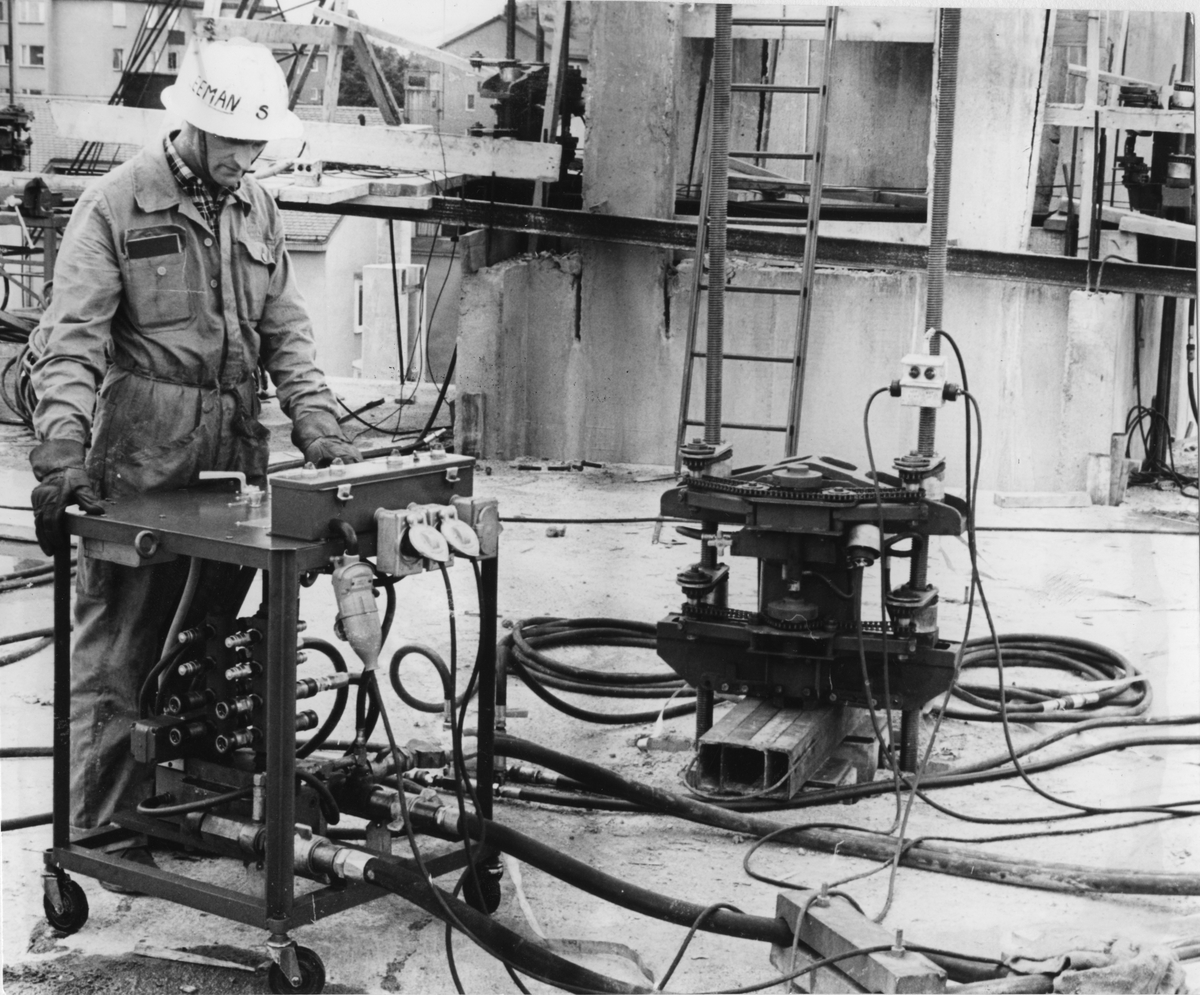 Den engelska experten Mr. Sleeman ses här centralt manövrera lyftningen av 3 st bjälklag i en operation. Den totala vikten är ca 600 ton.