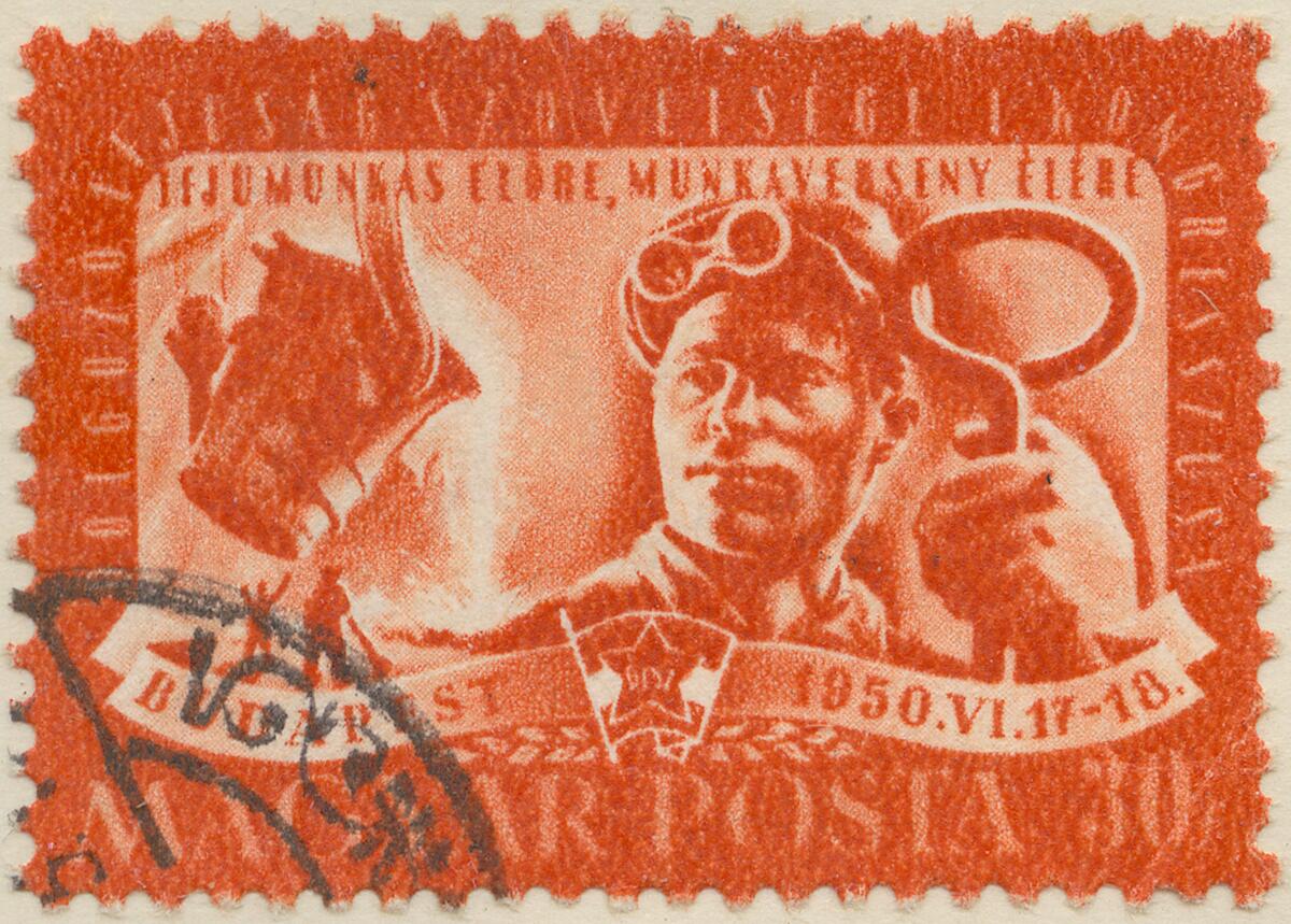 Frimärke från Ungern, 1950. Motiv av Gjuteri-Arbetare -Propaganda för Kongress för unga arbetare i Budapest 17-18 juni 1950-