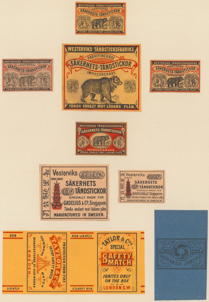 Etiketter för tändsticksaskar, från Svenskt Industri- och Handelsmuseum.
