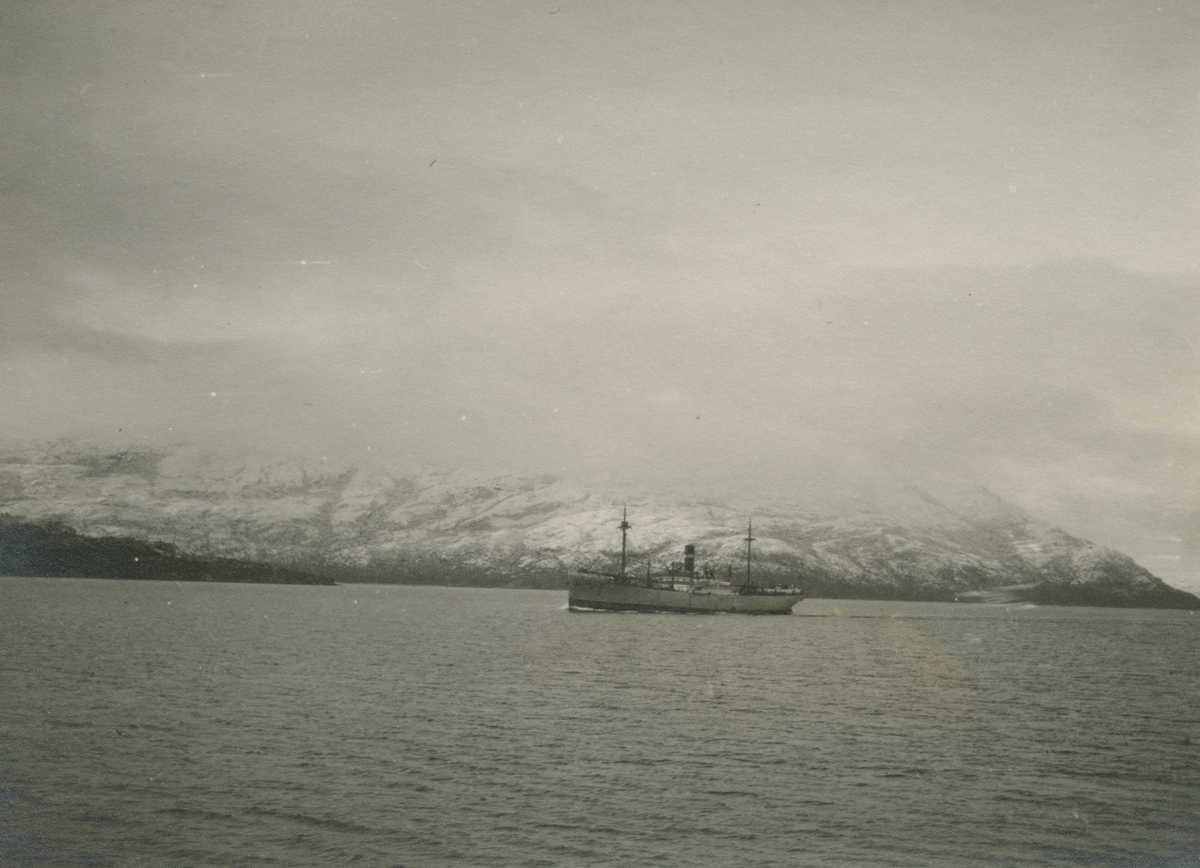 Fotografi från kuvert märkt med "Ernst Nordenskjöld". Motiv av fartyg på hav nära stort berg. Troligen Sydamerika/Peru.