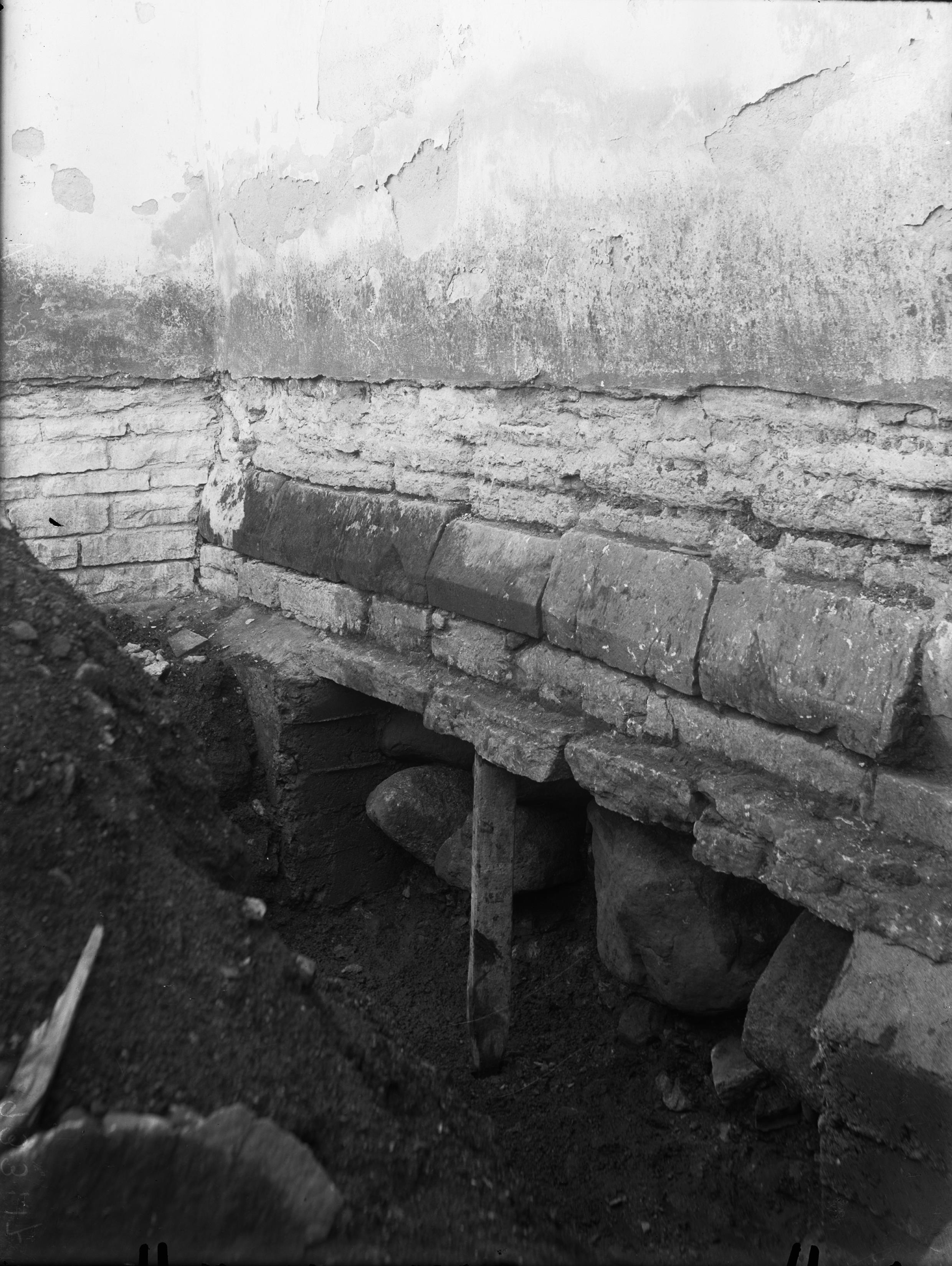 Norra fasaden mellan andra och tredje strävpelaren från väster, under pågående grundförstärkning, från nordväst.