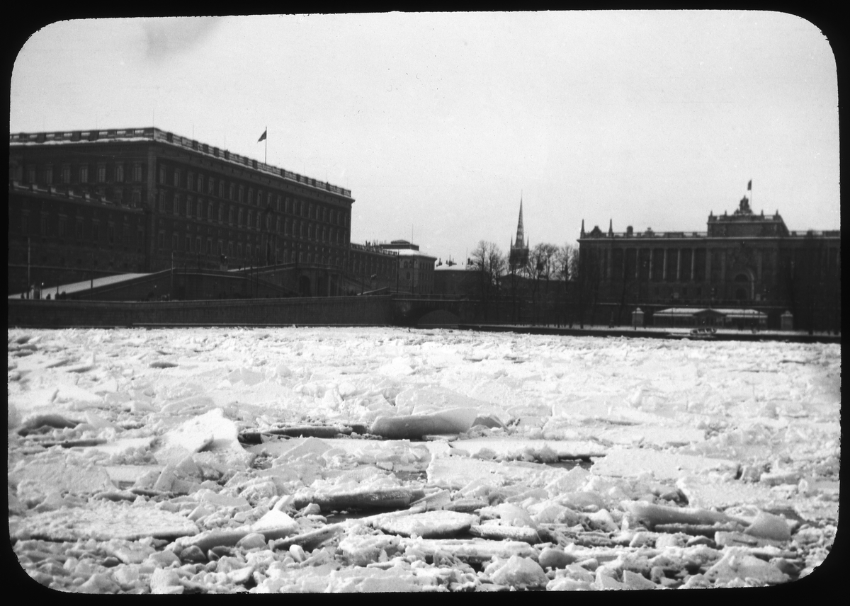Islossning. Stockholms stad. Slottet till vänster i bilden.