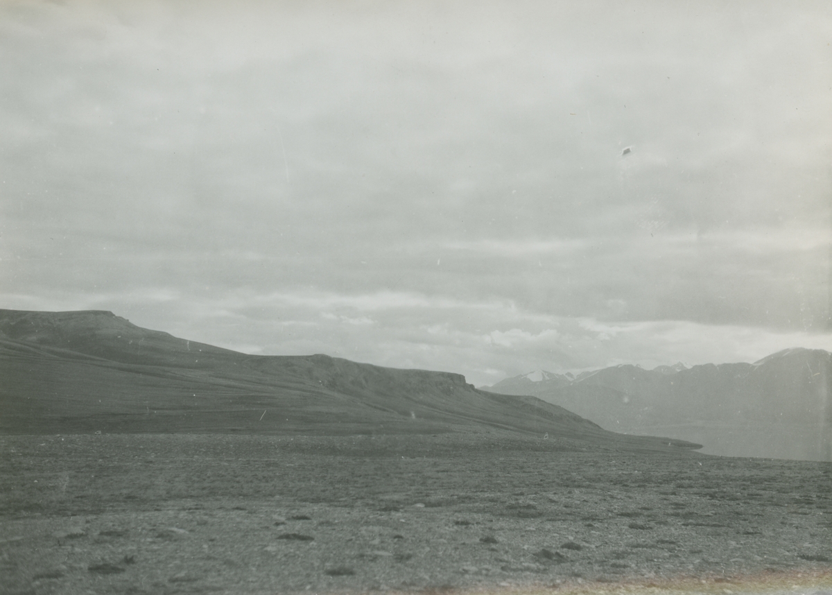 Fotografi från expedition till Östgrönland 1929. Dansk-svensk expedition under ledning av Lauge Koch. Svenska deltagare: Oscar Kulling och Helge Backlund. Vy över kargt bergslandskap och molnig himmel.