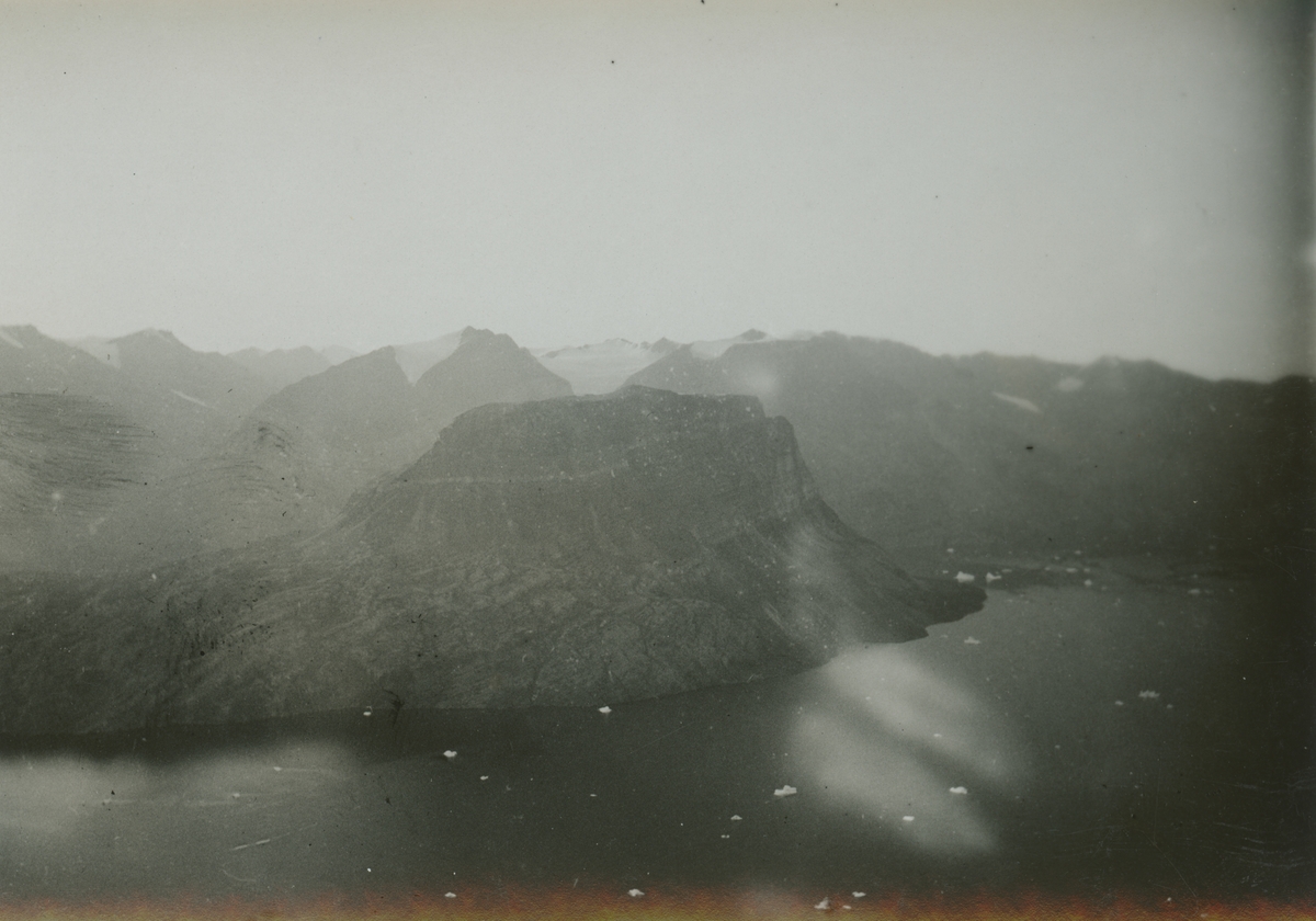 Fotografi från expedition till Östgrönland 1929. Dansk-svensk expedition under ledning av Lauge Koch. Svenska deltagare: Oscar Kulling och Helge Backlund. Vy över vatten, bergslandskap och himmel.