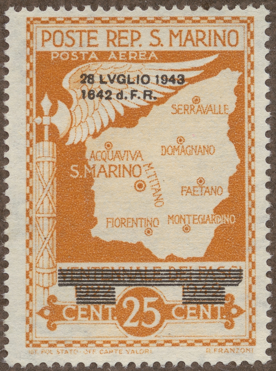 Frimärke från San Marino, 1943. Motiv av Fågelvinge Flygsymbol Karta över San Marino.