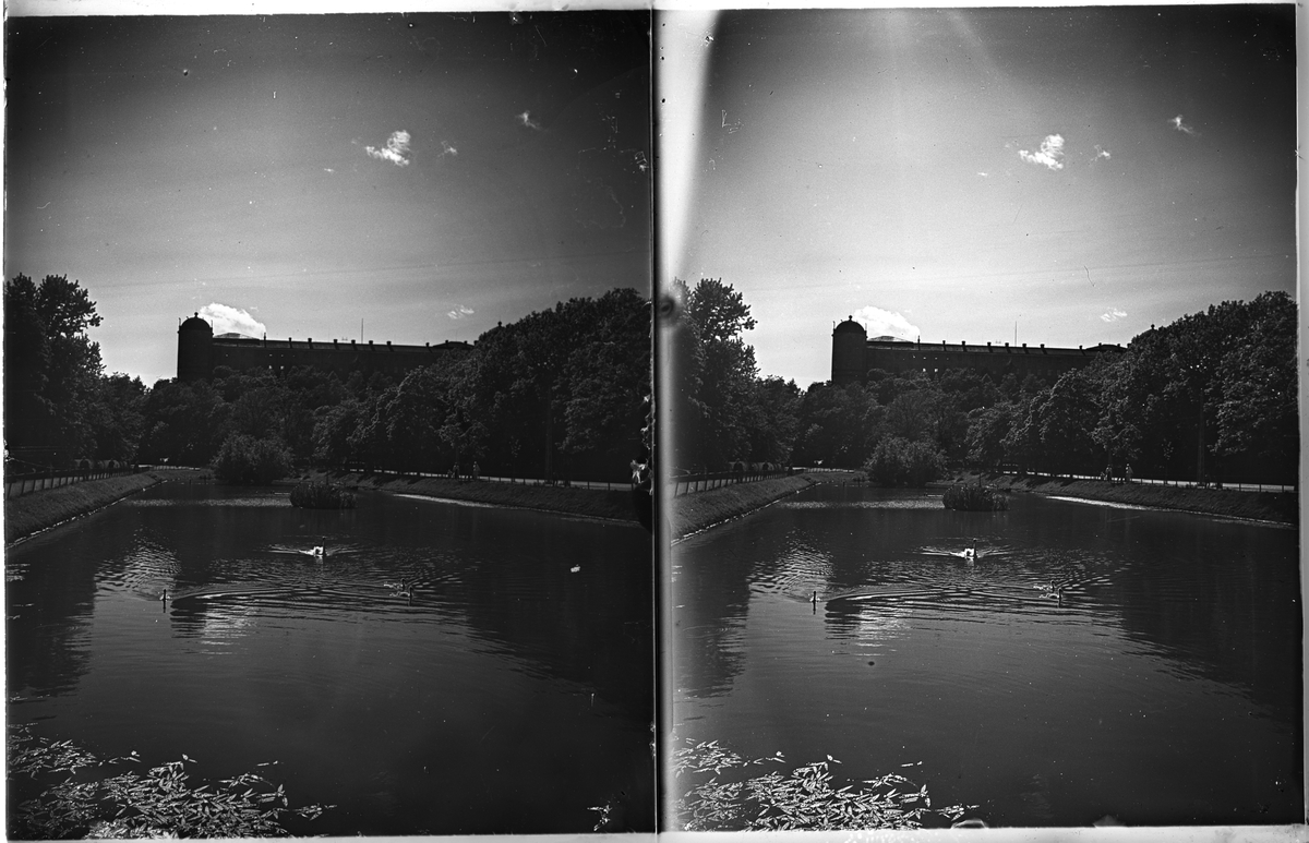 Stereonegativ, vy Fyrisån i Uppsala med Uppsala slott i bakgrunden.