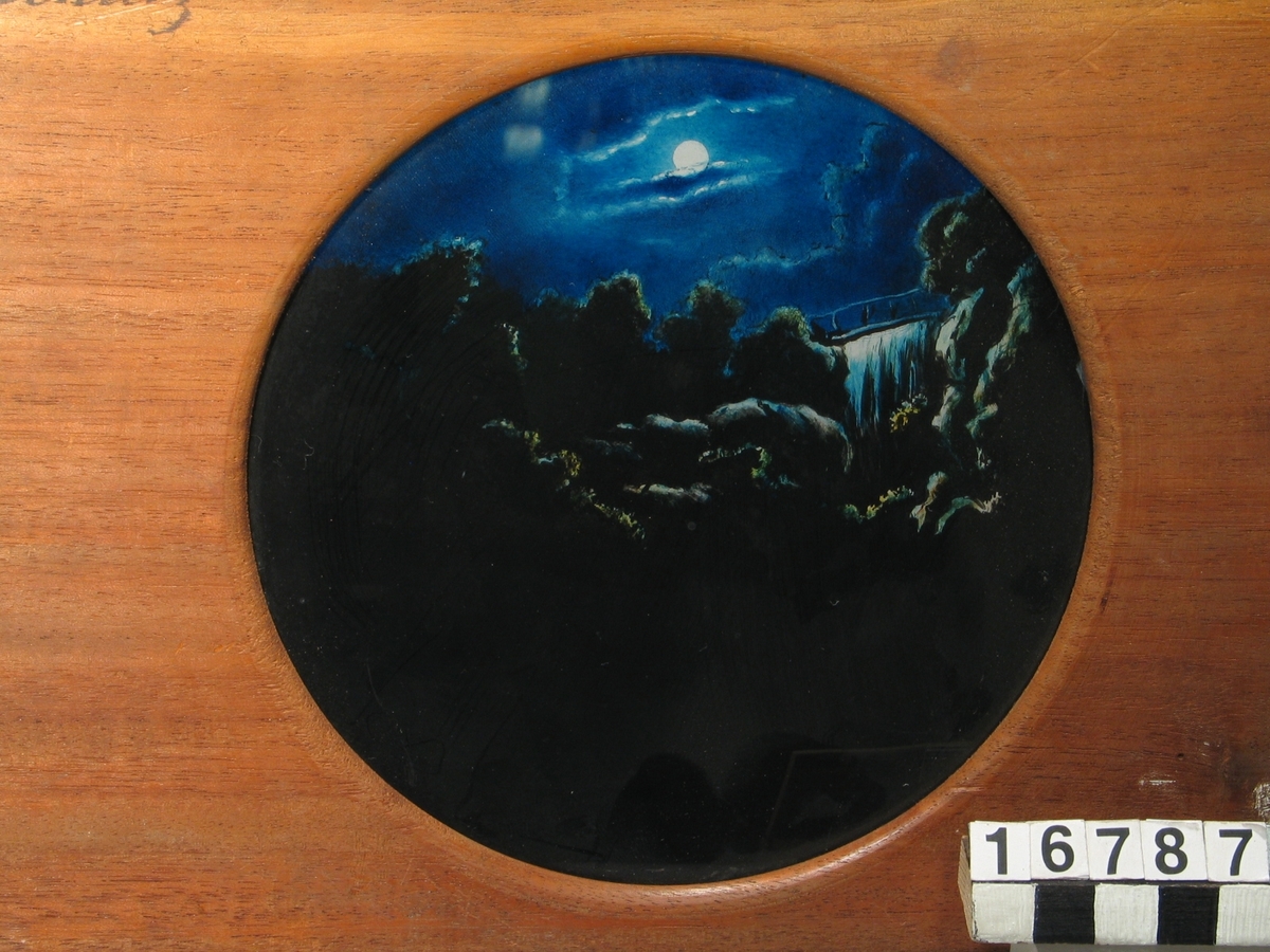 Laterna magica bild, handmålad på glas. "Friskÿtten". Vattenfall i natten.