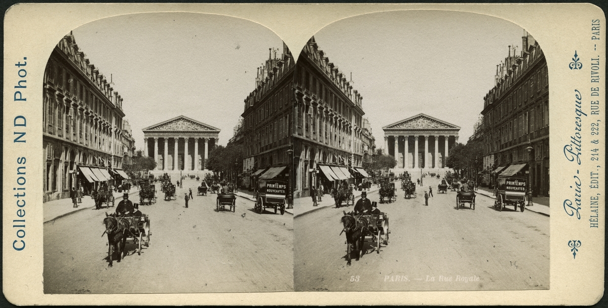 Stereobild med motiv från gatan rue Royale, Paris. Madeleine-kyrkan i bakgrunden.