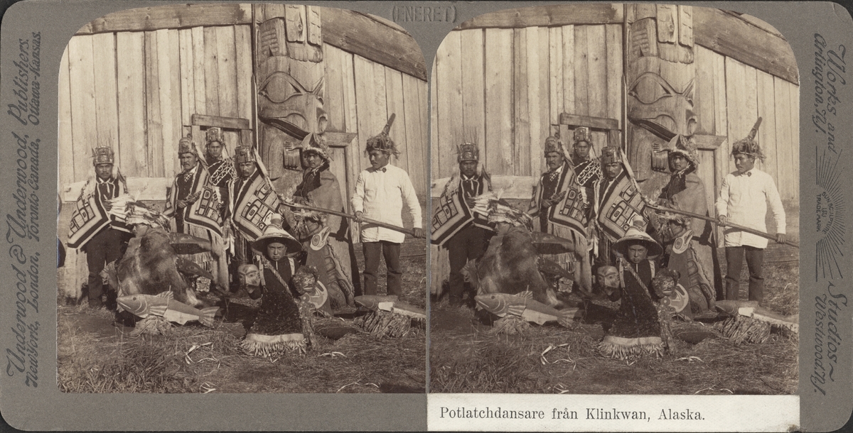 Stereobild av Potlatchdansare från Klinkwan, Alaska.