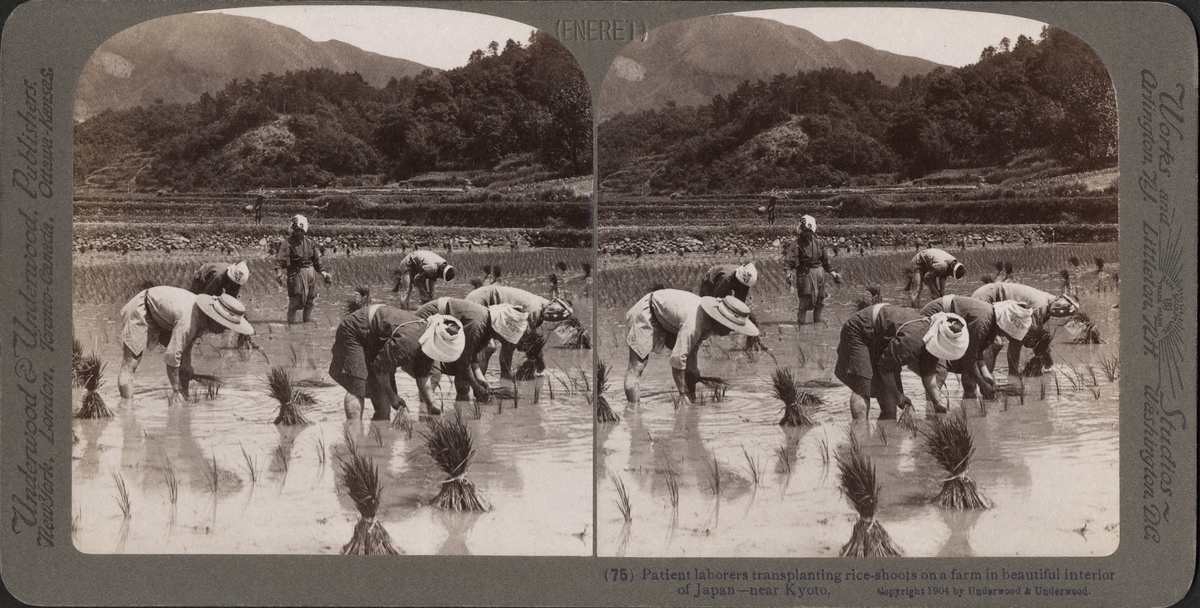 Stereobild av arbetare på risfält med berget Fuji i barkgrunden, i närheten av Kyoto.