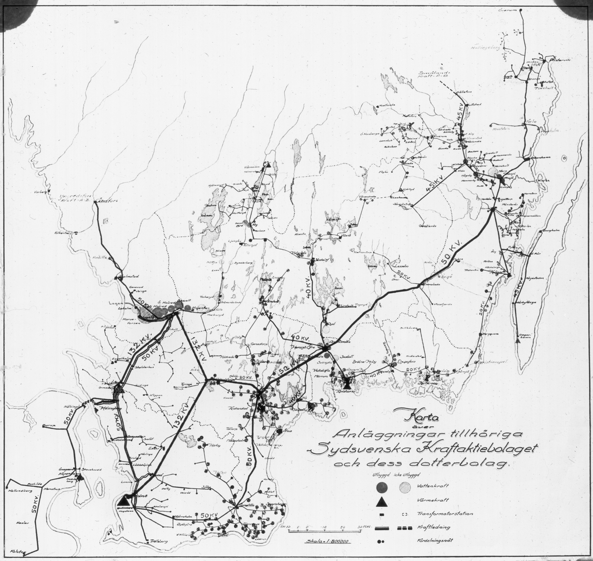 Ljusbild, karta över anläggningar tillhörande Sydsvenska Kraftaktiebolaget och dess dotterbolag.