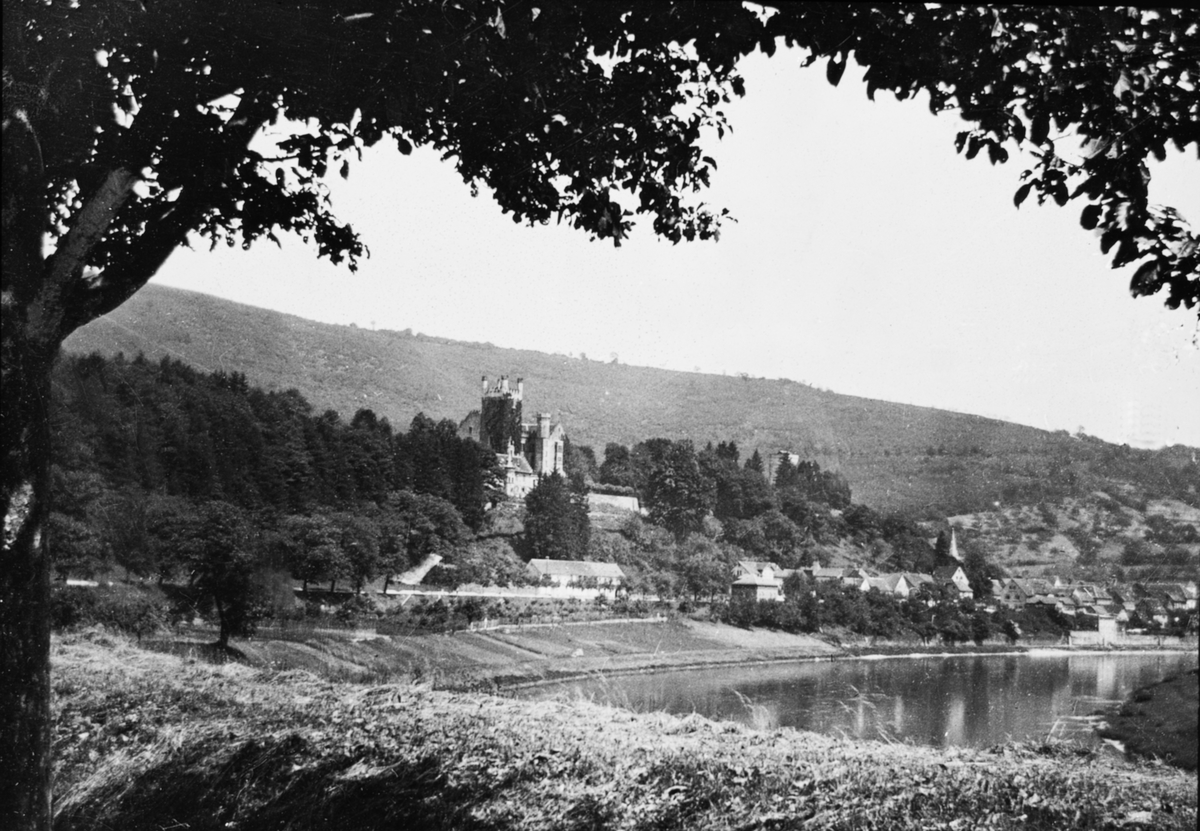 Skioptikonbild med motiv av slott vid floden Neckar vid Neckarsteinach.