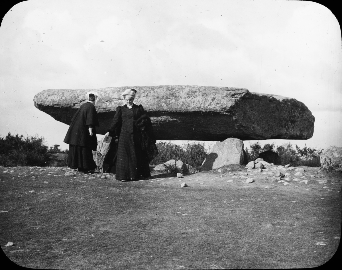 Skioptikonbild med motiv av två kvinnor vid Menhirer i Carnac.