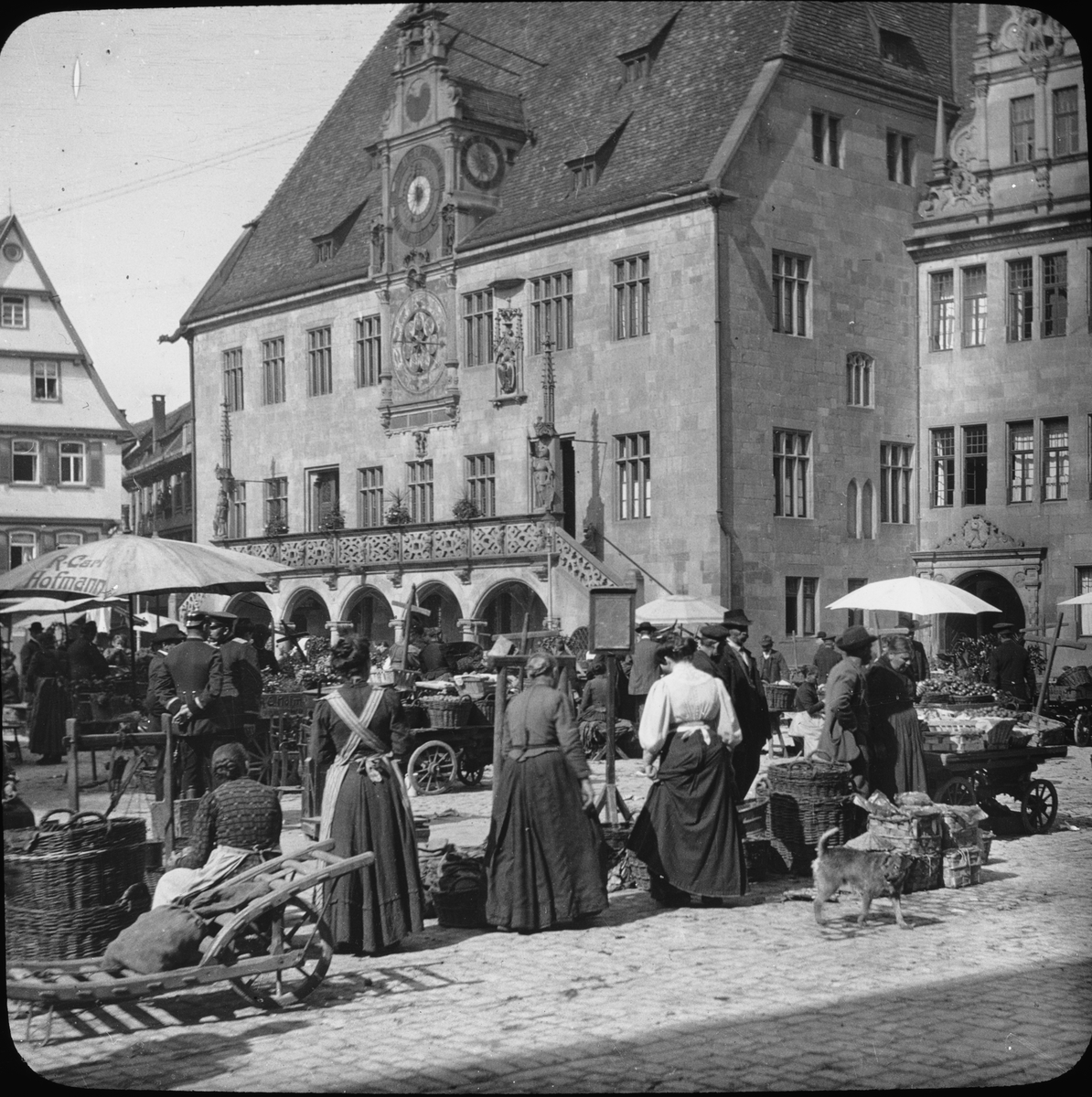 Skioptikonbild med motiv av marknad på torget framför rådhuset.