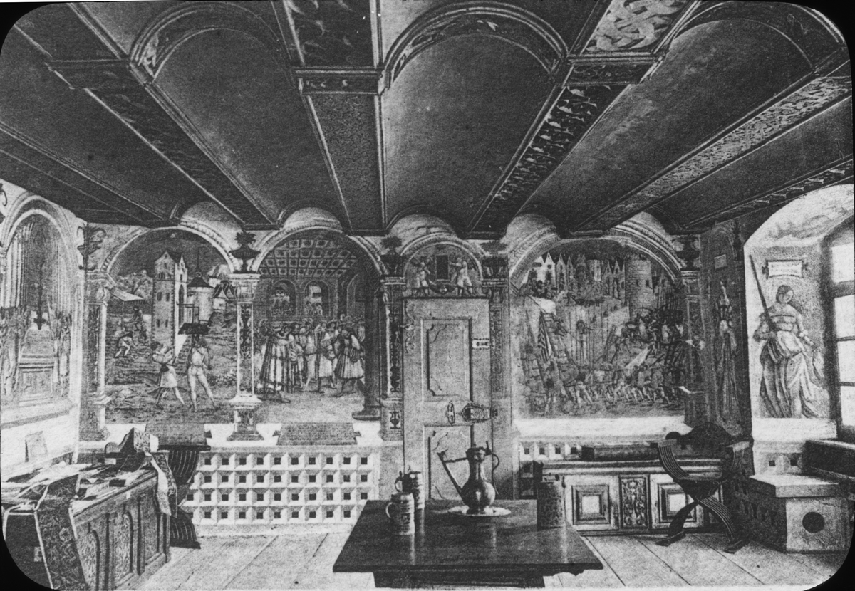 Skioptikonbild med tryckt motiv av interiör i Kloster St. Georgen Stein am Rhen.