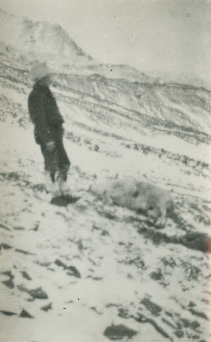 Fotografi från expedition till Spetsbergen. Motiv av expeditionsdeltagare med gevär som skjutit vad som troligtvis är en isbjörn.
