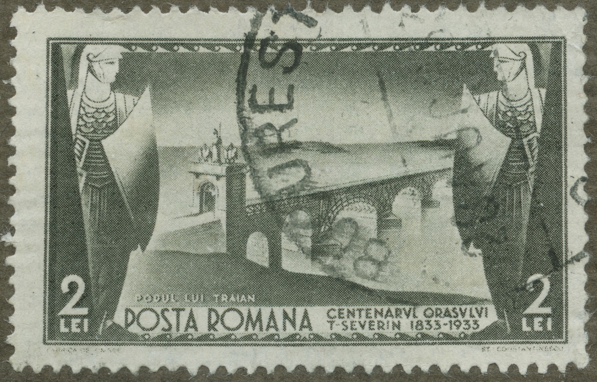 Frimärke från Rumänien, 1933. Motiv av Bro över Donau 100-årsminne: staden Turnu-Severin