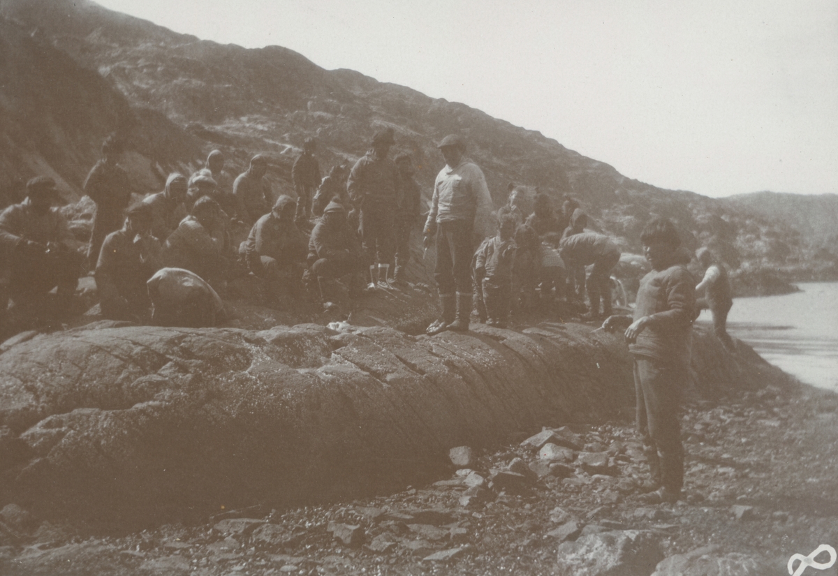 Fotografi från expedition till Grönland. Motiv av en grupp människor, både vuxna och barn, som är samlade på en klippa vid havet. Nedanför klippan syns en stenig strand.
