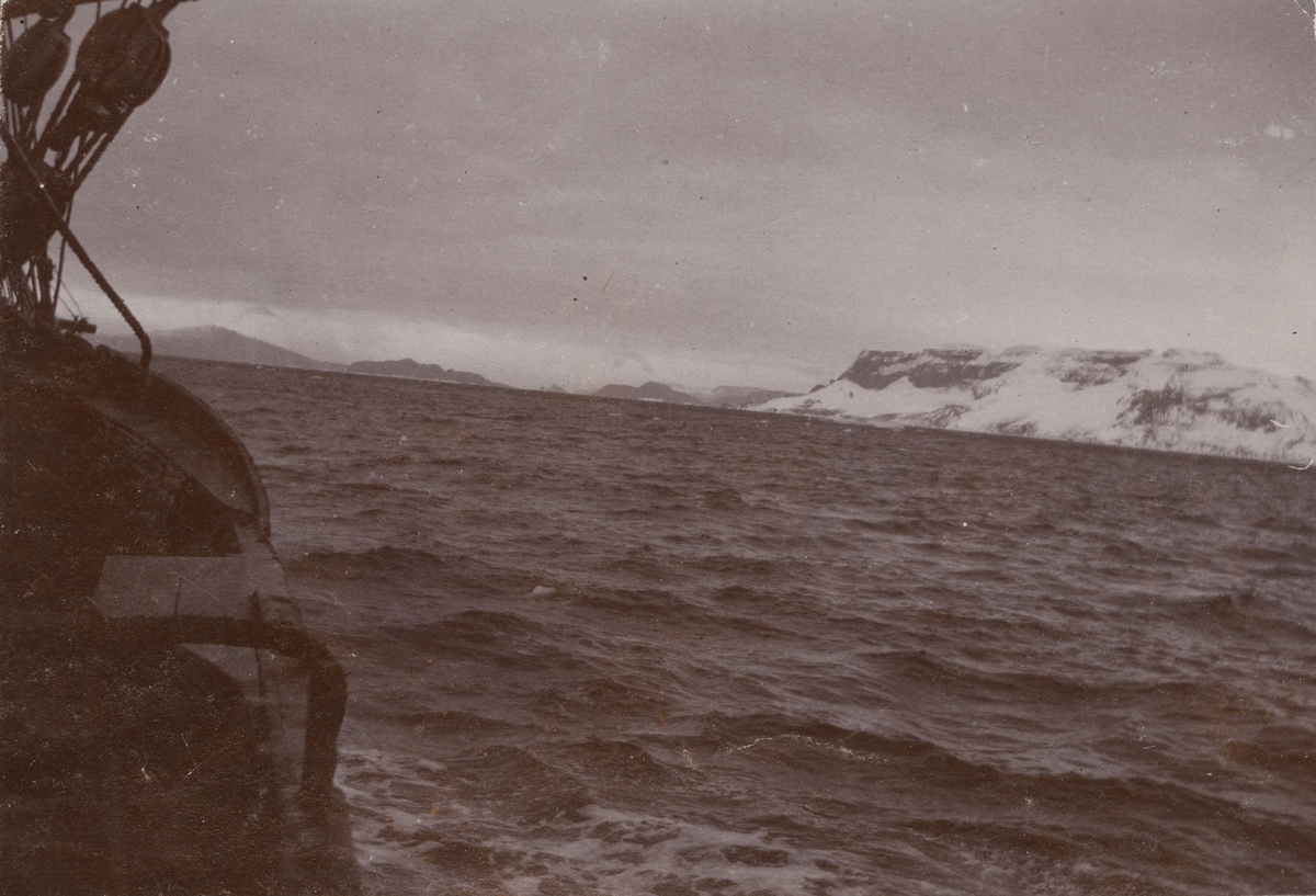 Fotografi från första svenska Antarktisexpeditionen 1901-1904. Vy över hav och snötäckta berg.