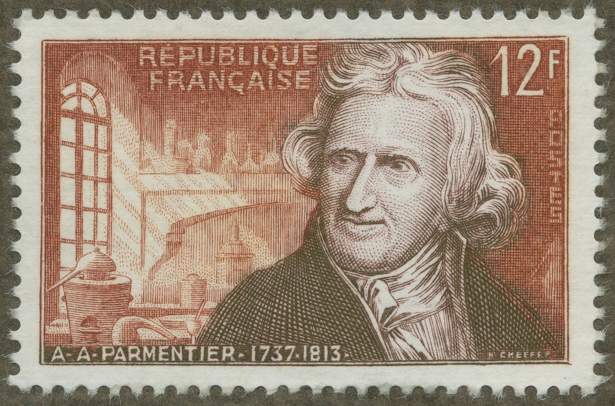 Frimärke från Frankrike, 1956. Motiv av A. A. Parmentier 1737-1813 Apotekare. Införde potatisodling i Frankrike nödåret 1769.