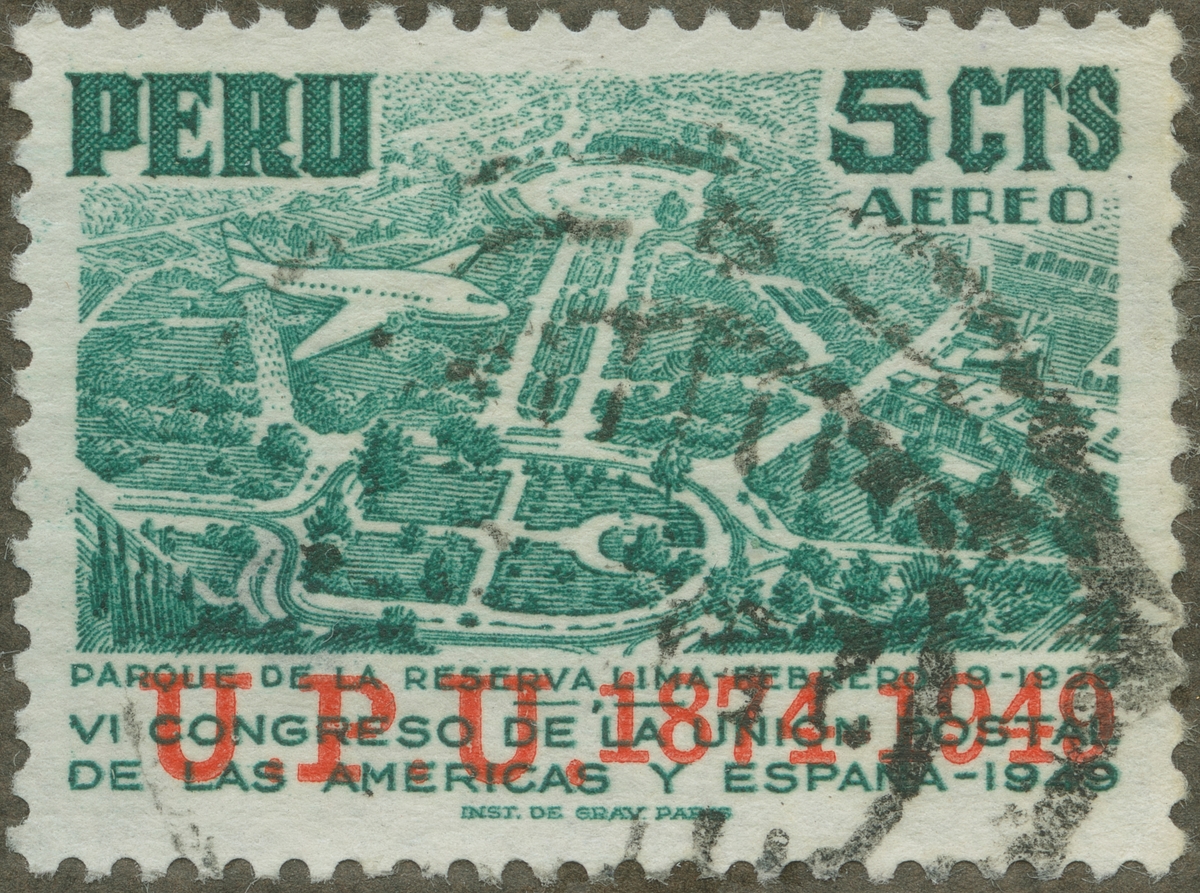 Frimärke från Peru, 1949. Motiv av "Reserva" parken i staden Lima. Däröver: monoplan. Världspostföreningen. 75 år 1874-1949. VI. Postkongress: Panamerikanska- o. spanska postföreningen: 1949.