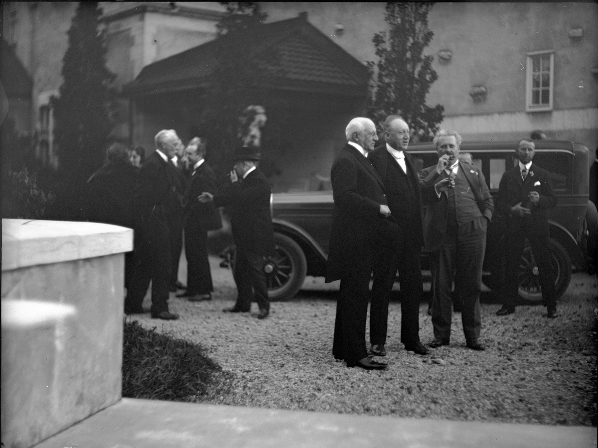 Glasplåt med motiv från Fotografiska Föreningen. Medlemmar i Fotografiska föreningen. Mannen i mitten längst fram är John Hertzberg.