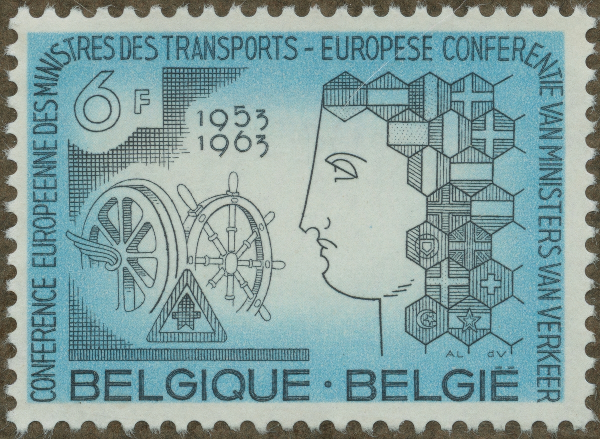 Frimärke ur Gösta Bodmans filatelistiska motivsamling, påbörjad 1950. Frimärke från Belgien, 1963. Motiv av diverse symboler för kommunikationsväsen. "10-årsjubileum: europeisk kommunikationsväsen: 1953-1963 Kongress."