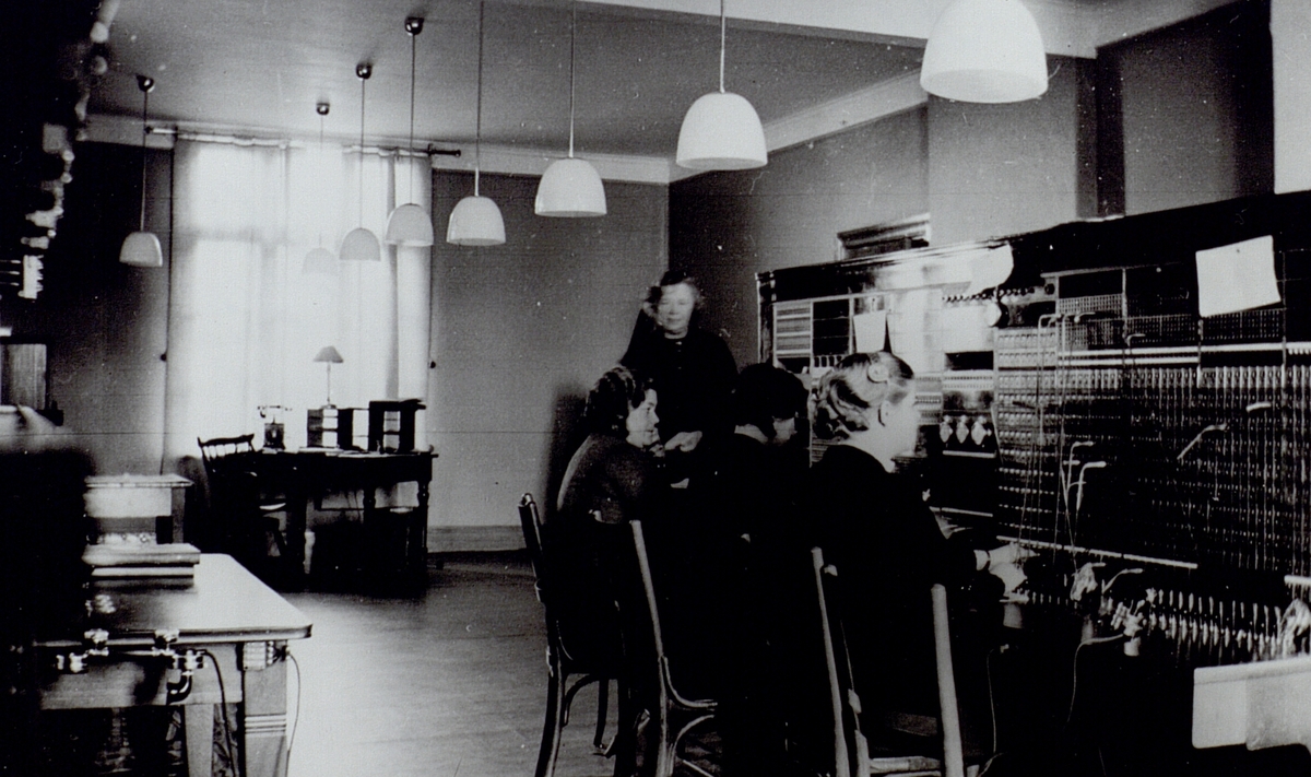 Ljungby telefonstation i slutet på 1930-talet. Sittande vid växelbordet från vänster Gerda Bengtsson, Kerstin Sjölin, Magda Tomsen och Elsa Ring.