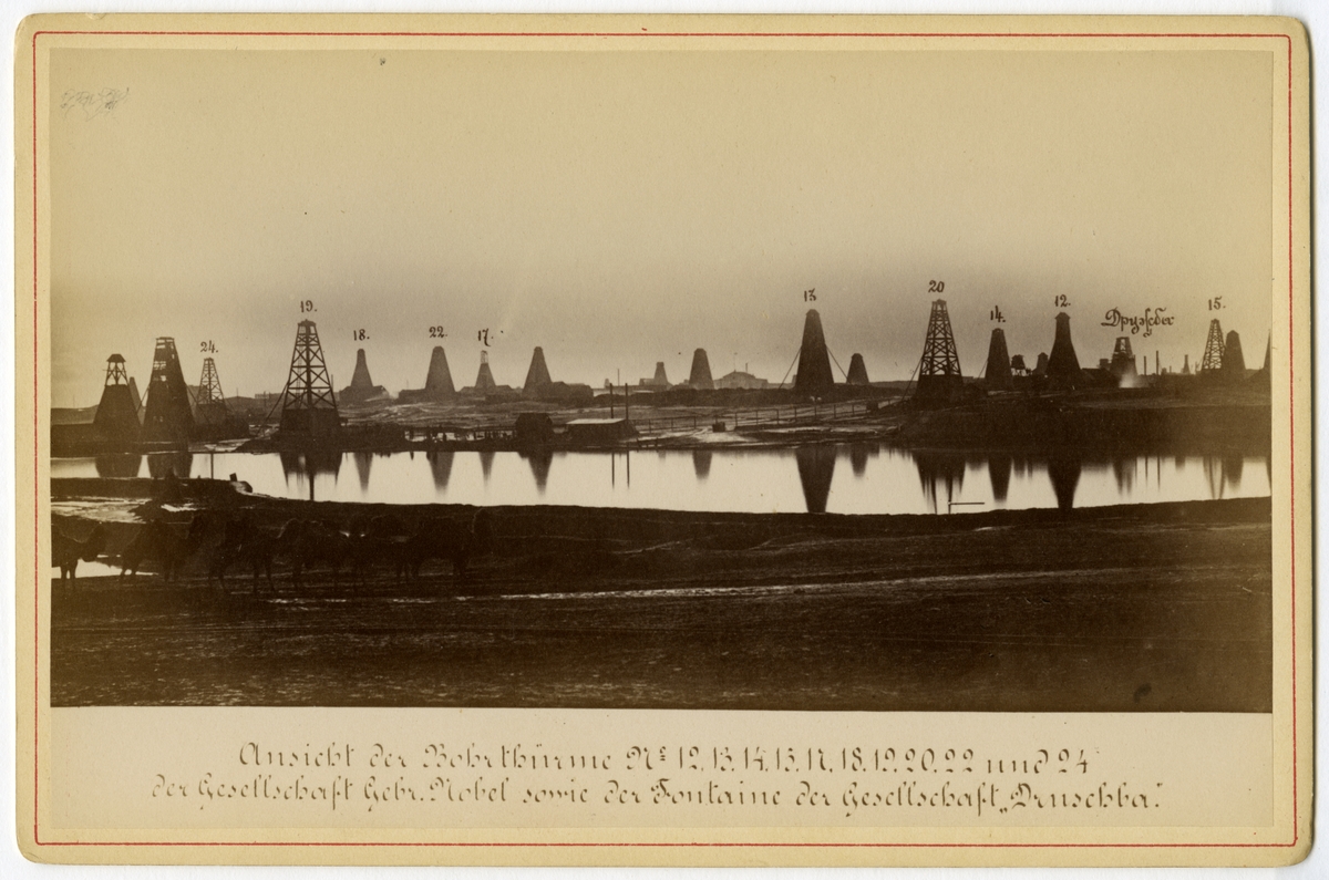 Utsikt mot borrtornen Nr 12,13,14,15,17,18,19, 20, 22 och 24 tillhörande Bröderna Nobel. Bilden visar även Fontänen tillhörande aktiebolaget Druschba. (mer text finns på baksidan av fotografiet).