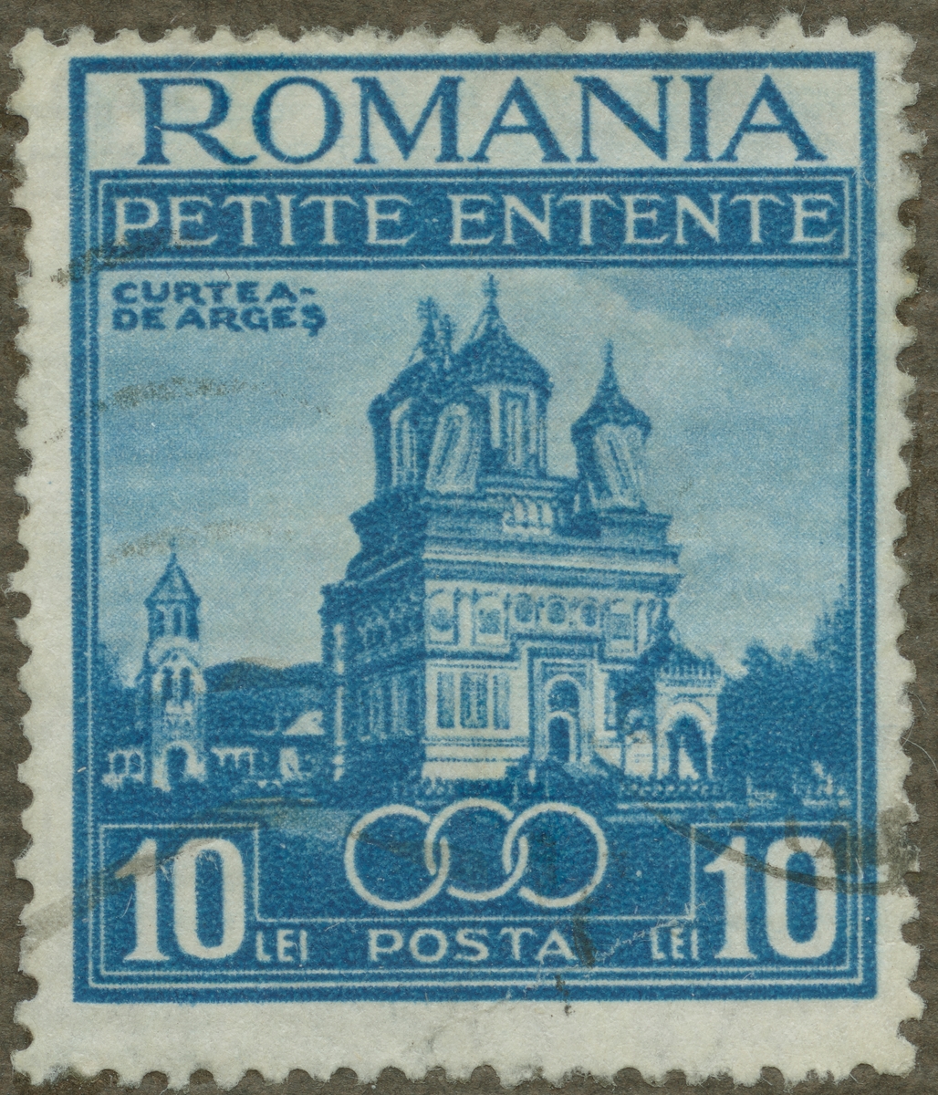 Frimärke från Rumänien, 1937. Motiv av Curtea de Arge Katedralen med konungamausoleum. "16-årsminne av grundandet av "Lilla Ententen" (Tjeckoslovakien, Rumänien och Jugoslavien: 1920-1936)".