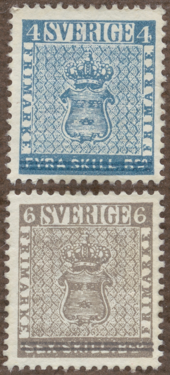 Frimärken från Sverige, 1955. Motiv av (överst) Reproduktion av 4-skilling frimärke (nederst) Reproduktion av 6-skilling frimärke: -vapentyp "Svenska frimärket 100 år: 1855-1955 -Till Nordiska filiatelistkongressen: 7-9 augusti, 1955-"