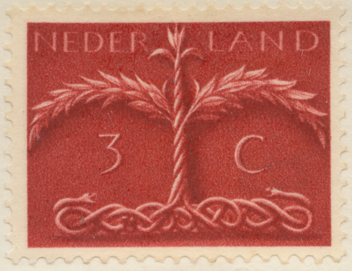 Frimärke från Nederländerna, 1943. Motiv av träd med ormrötter.