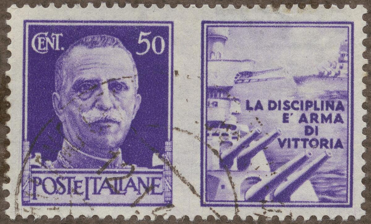 Frimärke från Italien, 1942. Motiv av Fartygsartilleri (t.v.) Kung Victor Emmanuel III.