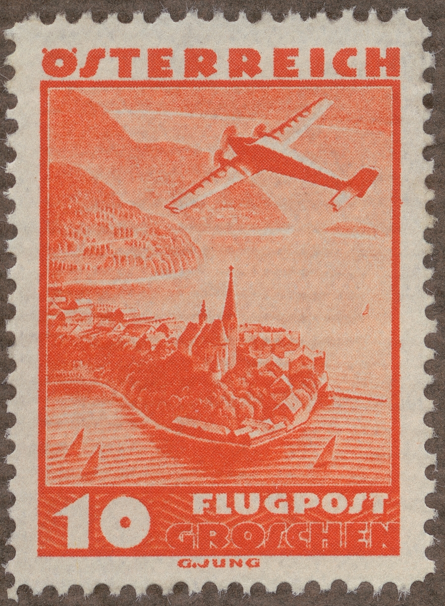 Frimärke från Österrike, 1935. Motiv av Österrikiskt monoplan Över Maria Wörth