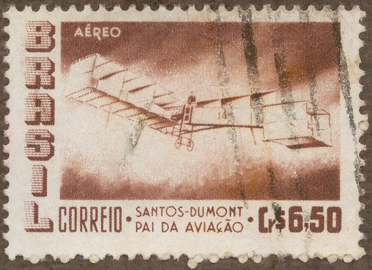 Frimärke från Brasilien, 1956. Motiv av Biplan med vilken Brasilianaren Alberto Santos-Dumont (1873- 1932) gjorde sin första motordrivna flygning d. 23 oktober 1906 på Bagatelle övningsfält, Paris. Den 12 november 1906 s.å. flög han över samma fält 220m. på 21 sek. "-50-årsminne: 1906-1956."