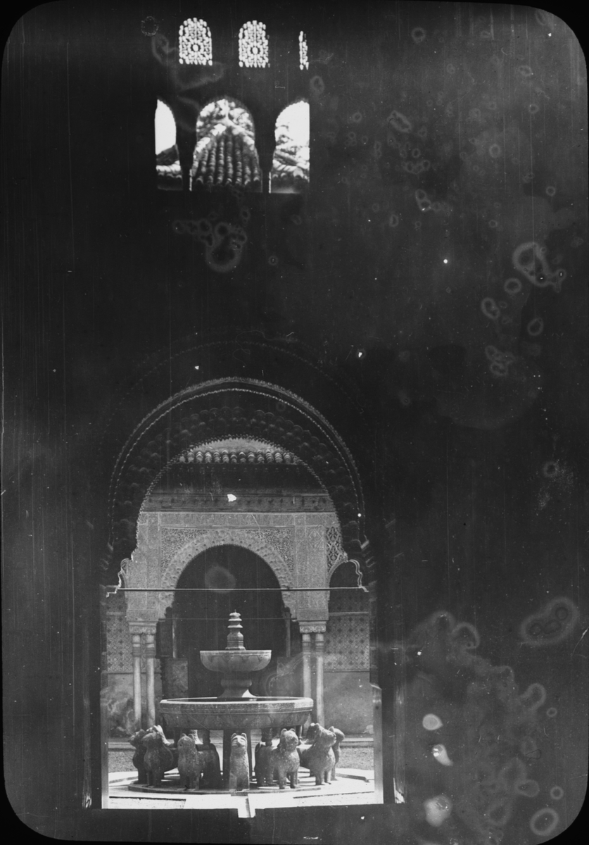 Skioptikonbild med motiv av lejongården vid palatset Alhambra, Granada.
