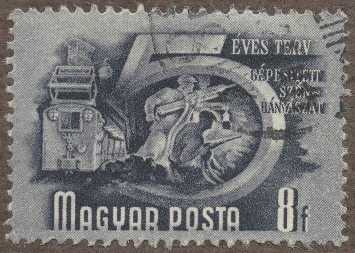 Frimärke från Ungern, 1950. Motiv av Ungerskt gruvarbete. Propaganda för en ny femårsplan.